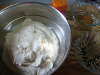 Take out the dal paste from the fridge and and add 2 tbsp of water. Whisk for few minutes till light and fluffy .You can test your paste if the consistency is right or not by dropping a drop of the mixture in a glass of water .If the drop floats then it is right and if it drops down to the bottom then the mixture is heavy and you need to beat more .If the mixture is too thick add few drops of water and then beat .It will take only few minutes .