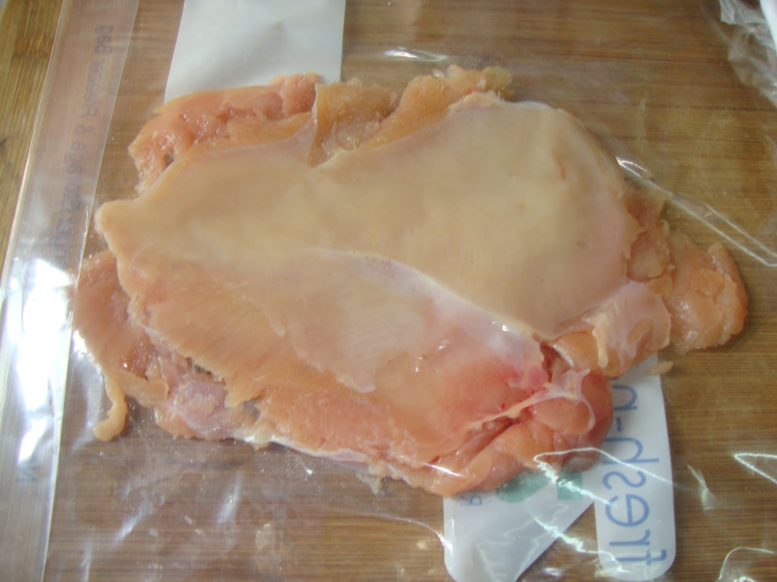 Pound each chicken pieces with a tenderizer or a rolling pin to thin the chicken breasts.